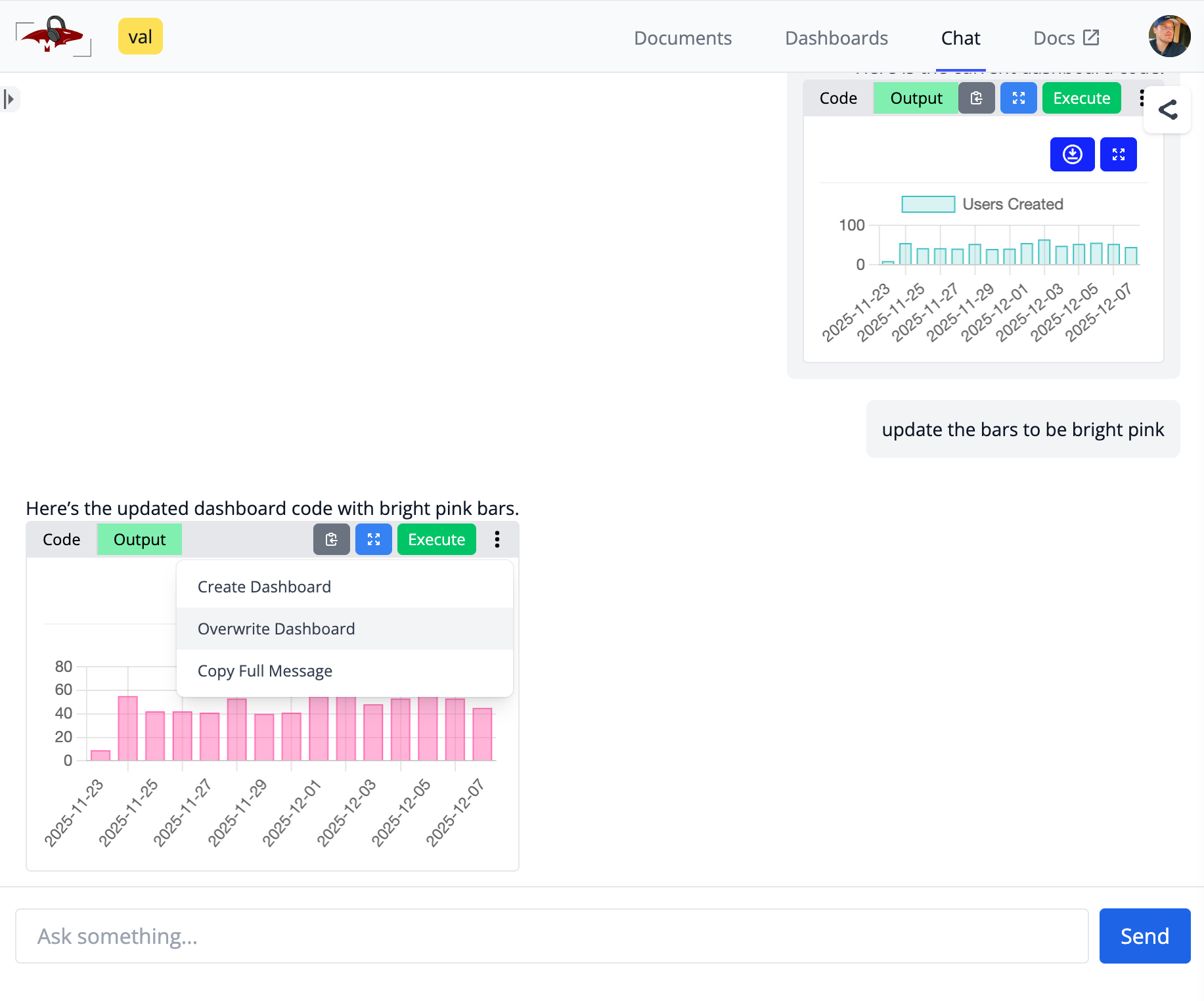 You can use this to easily edit existing dashboards, from basic tasks like updating colors to more sophisticated tasks like adding new elements. Iterate on your dashboard in the chat tab, and then click "Overwrite Dashboard" to update your dashboard.