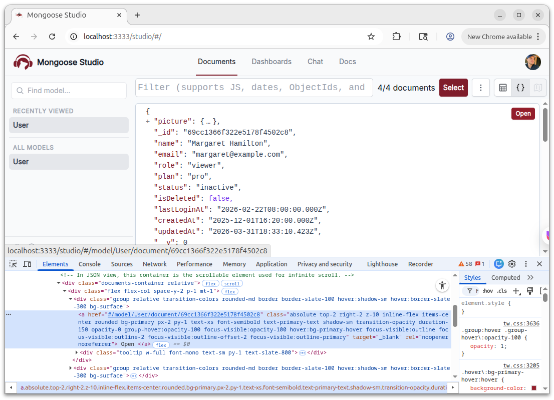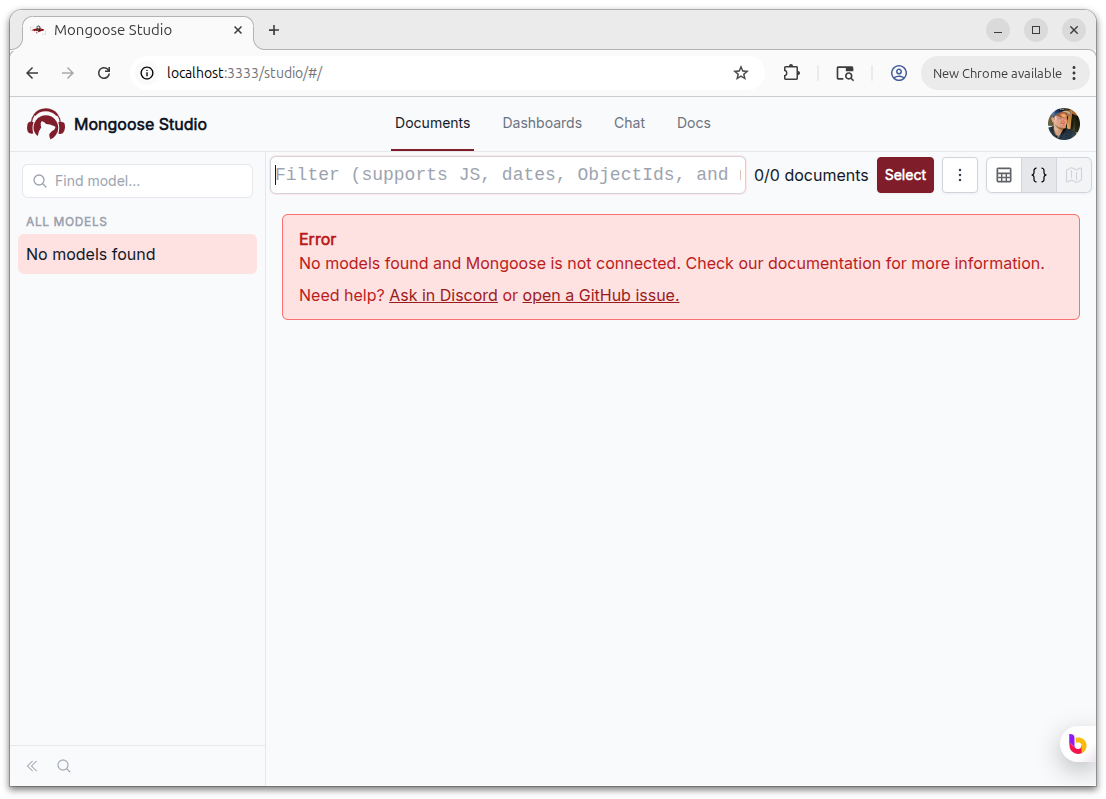 When Mongoose Studio can't connect to your MongoDB instance, the connection error screen now shows links to ask in Discord and open a GitHub issue. If you're stuck on a connection problem, you can get help directly from the error state without searching for support channels.